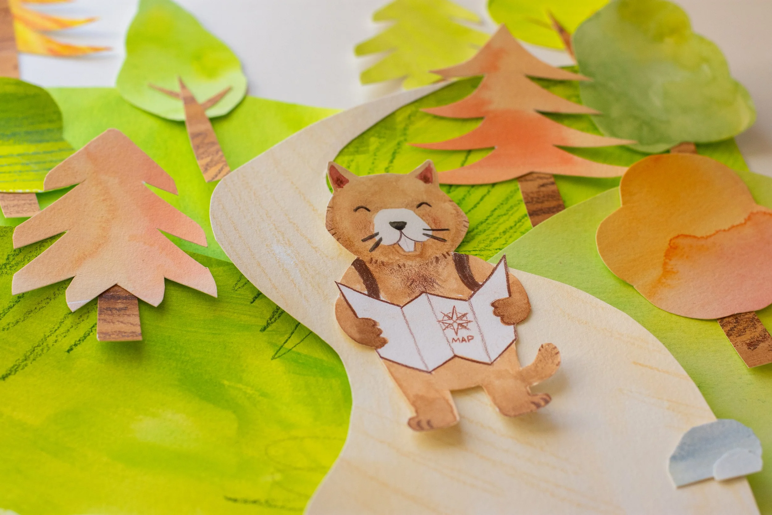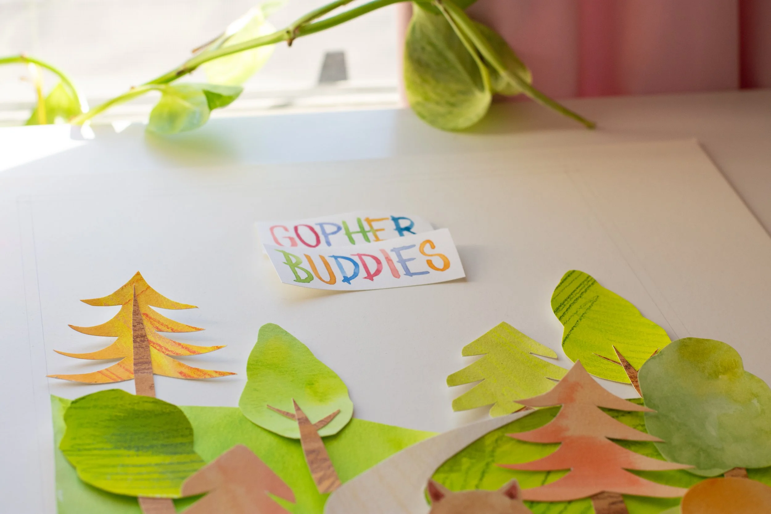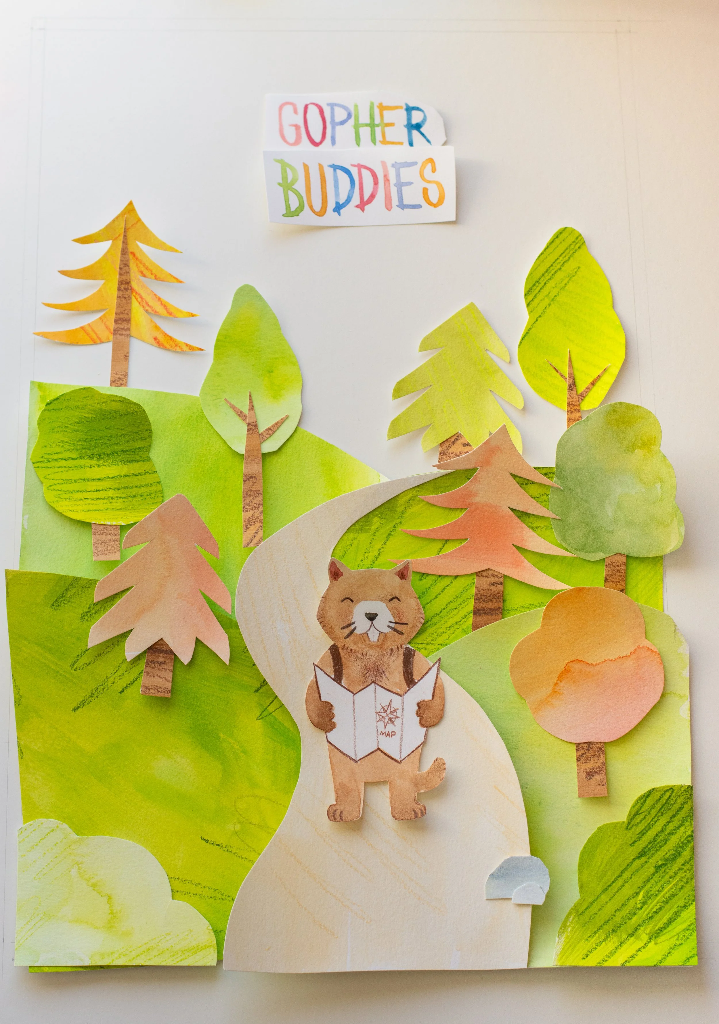 I wanted to create an illustration by hand that would also be cute for young ages. I started off experimenting with colors and developing a gopher character. Then I decided upon watercolor and collage as the medium. I painted various pages, drew on top with colored pencil for texture, and then cut out the elements. Finalizing the illustration involved gluing elements down, getting a high res scan, and then working in Photoshop to clean things up.
