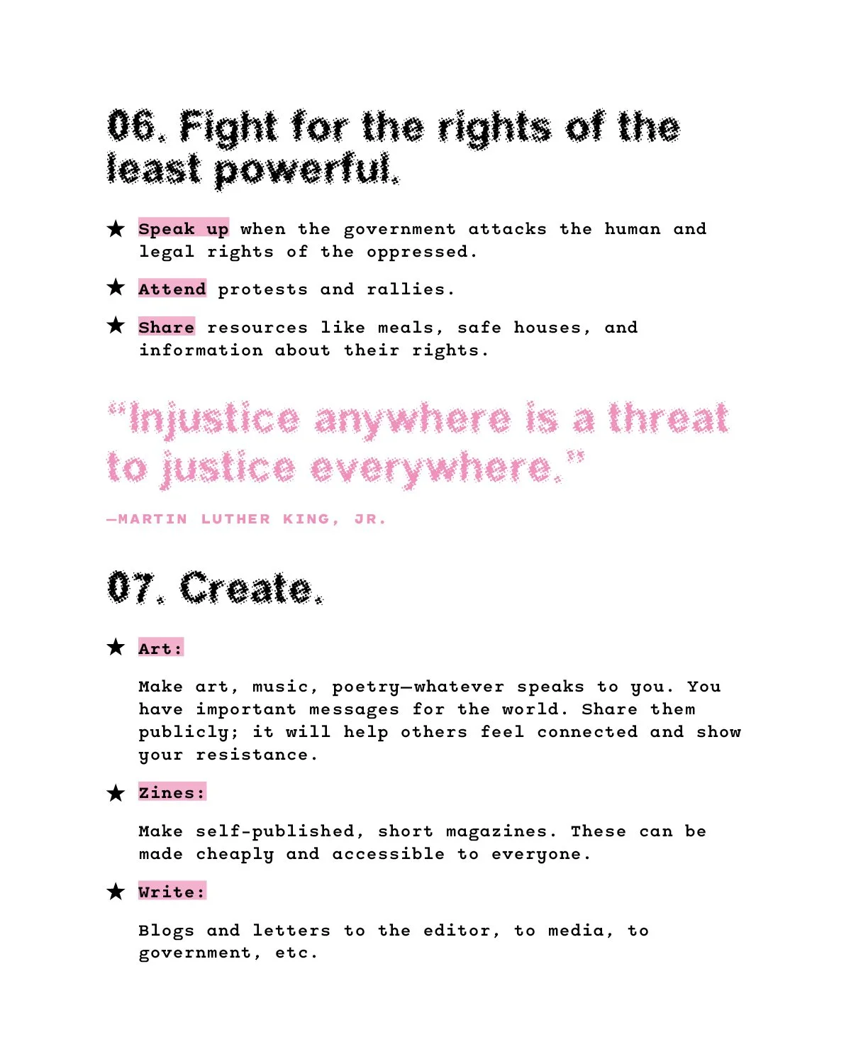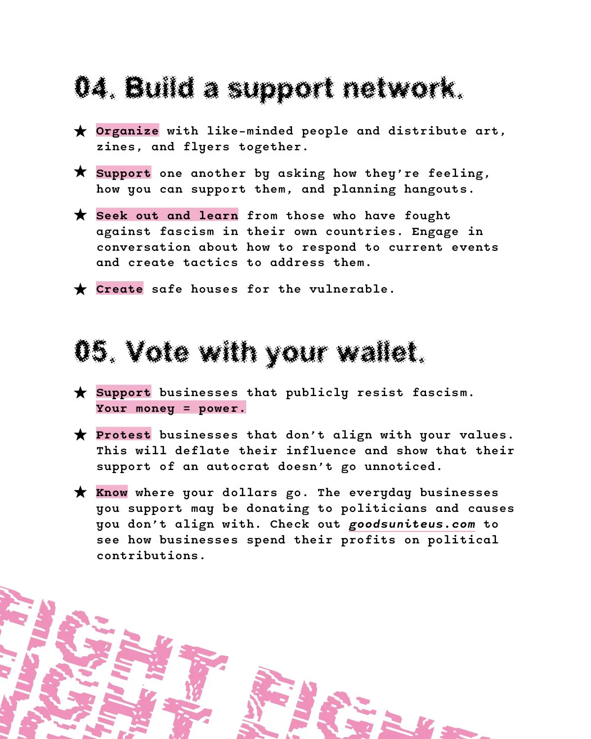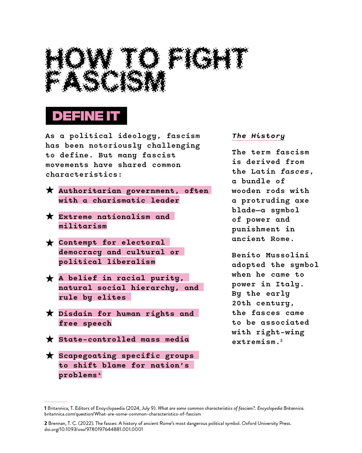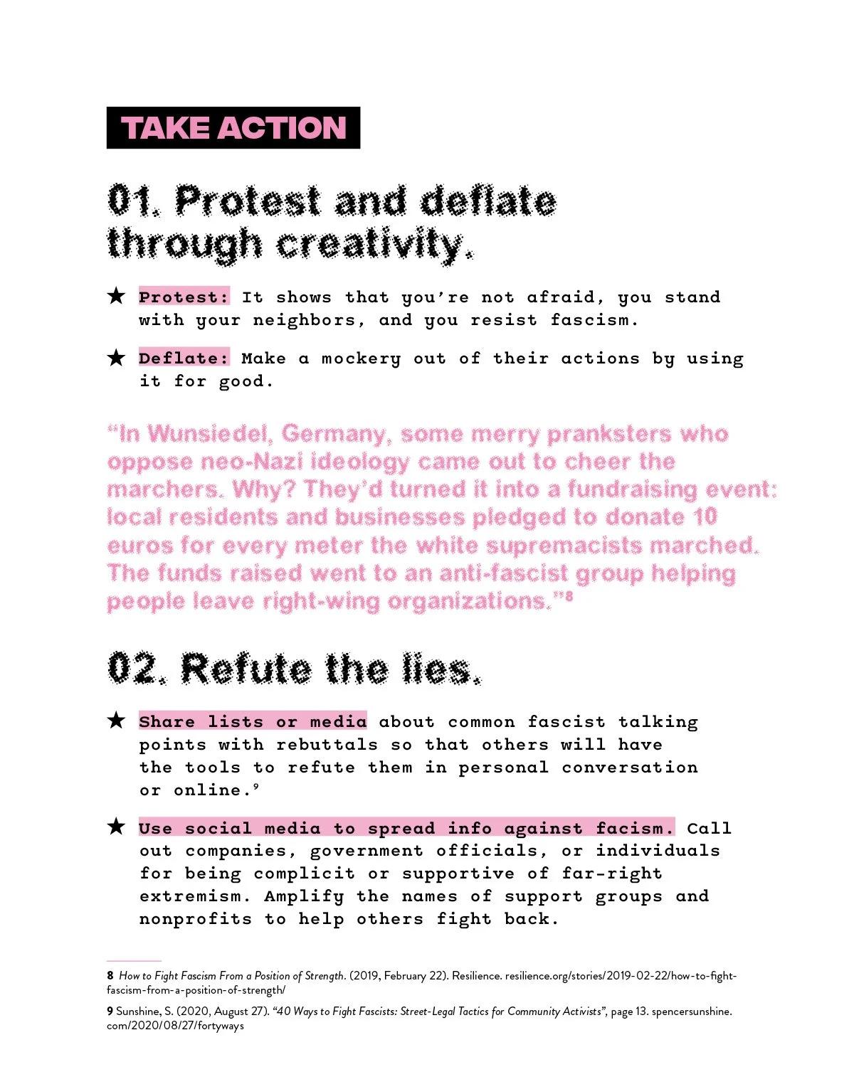 An informational zine on how to define, recognize, and take action against fascism. Created in collaboration with Emily Andrews, a writer with an MFA in creative nonfiction. This zine seeks to educate and arm those in the fight against fascism.