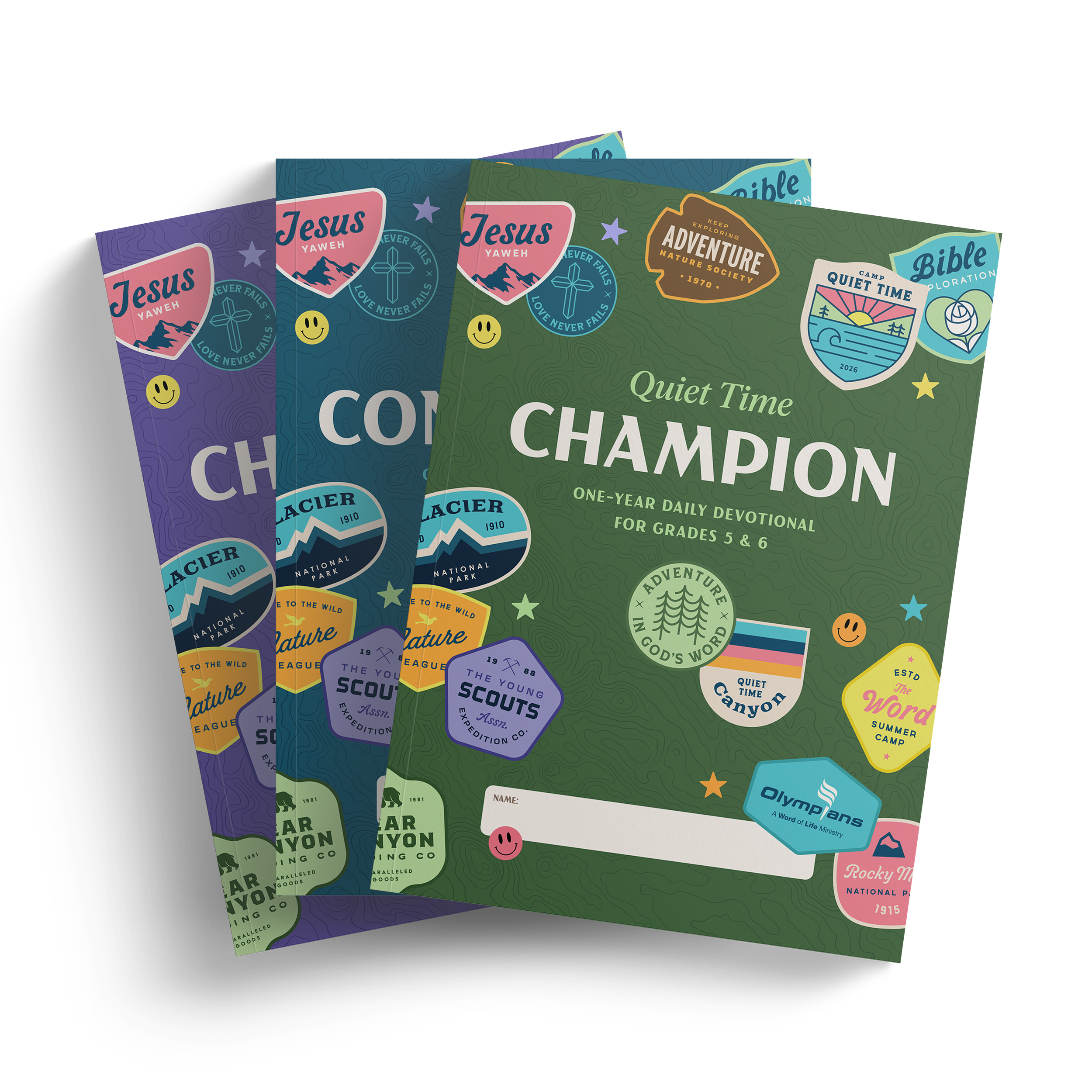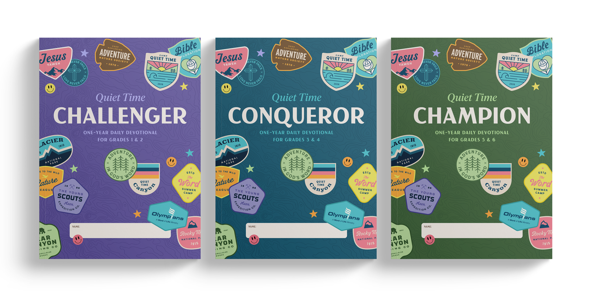 I wanted the feel of these covers to be fun and colorful for the kids. I loved the aesthetic of camping because devotionals are, in a way, spiritually directional. I created custom vector stamps and changed the color scheme based on each grade.