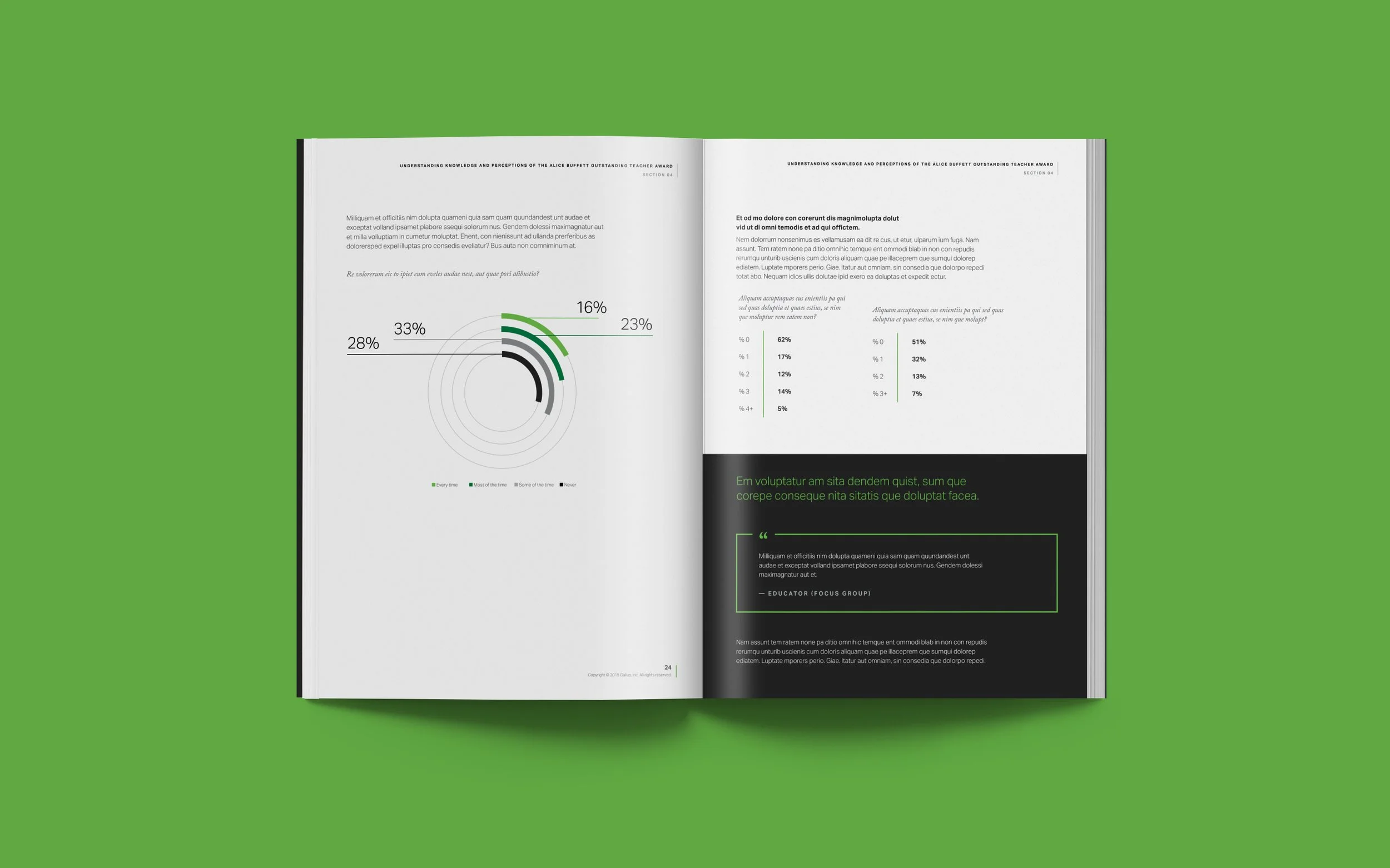 The Buffett Foundation wanted a report co-branded with Gallup: it was the outcome of Gallup surveys. They wanted minimal, clean design that was elevated but didn't want the content to be lost. I took Gallup's brand and designed along clean shapes and solid colors while focusing on the typography and the content within.